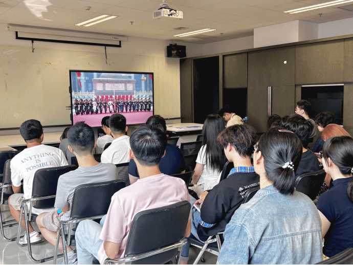 2025级研究生本科生在国际大厦1053会议室晨读厅集合,怀着崇敬之心等待大会开启。直播过程中,全体员工全神贯注,认真聆听中共中央总书记、国家主席、中央军委主席习近平发表的重要讲话,专注观看阅兵式与分列式各个环节,共同见证这一庄严时刻。