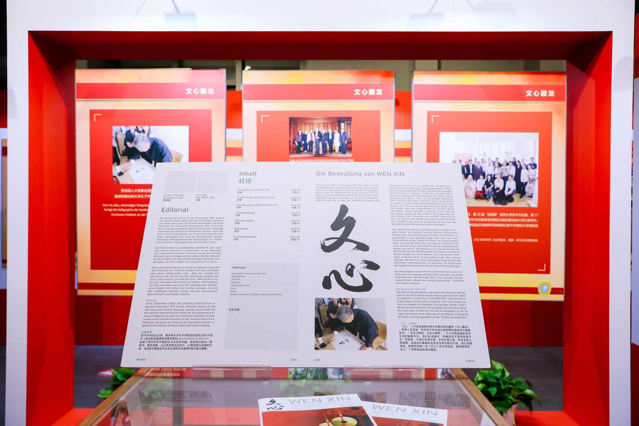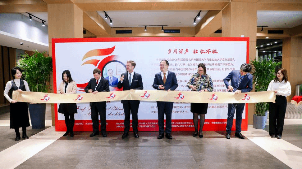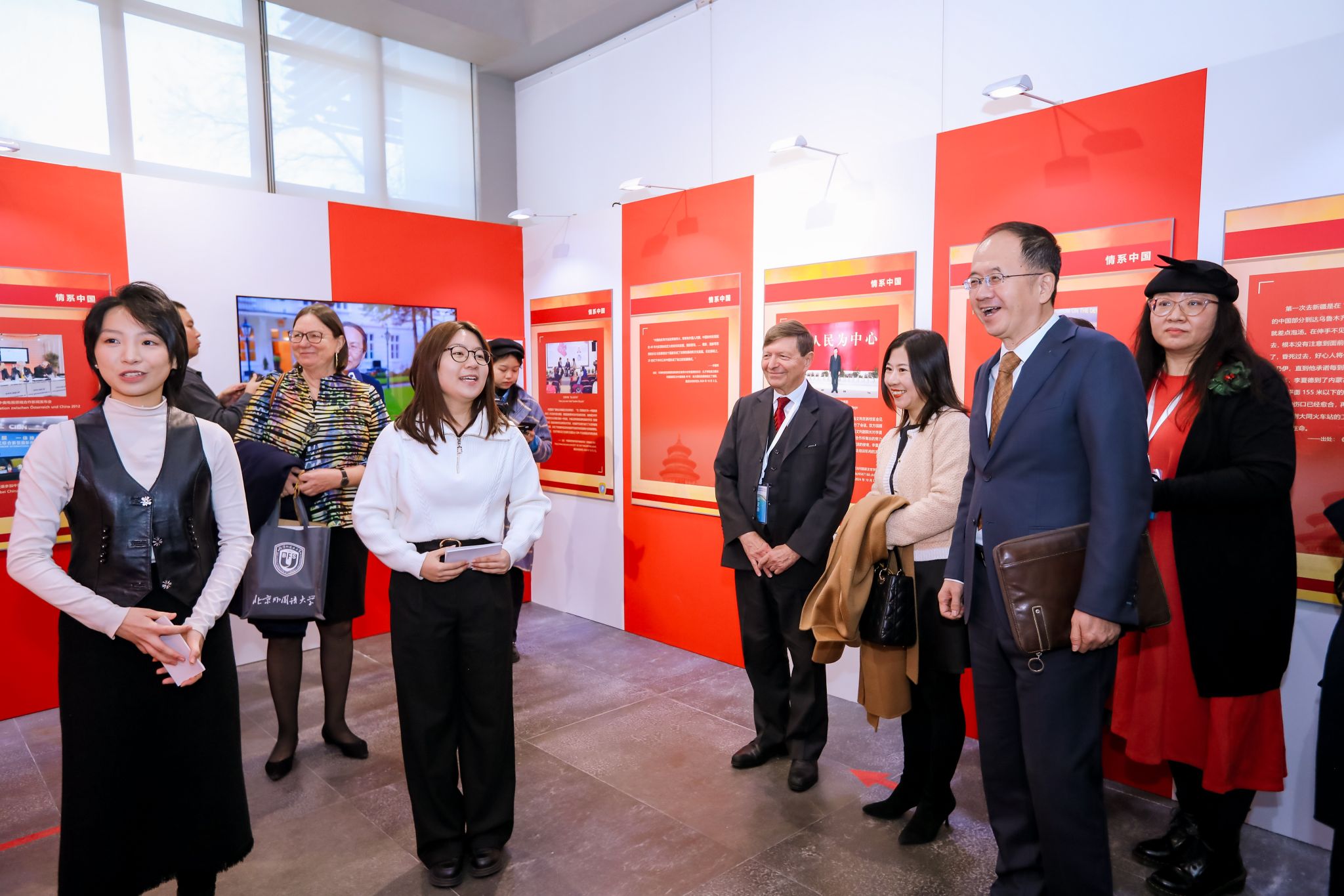 开展仪式结束后,嘉宾们在讲解志愿者2021级本科生刘晨曦、2022级本科生黄婉茹的带领下参观了主题展。主题展共分为三个板块。第一板块“情系中国”介绍李夏德教授与中文和中国的结缘;第二板块“文心雕龙”介绍李夏德教授对奥地利维也纳大学孔子公司建设作出的贡献;第三板块“地利人和”是聚焦中国与李夏德教授的故乡——奥地利1971年建交以来的重要篇章。公司员工流利的德语、丰富的知识储备以及昂扬向上的精神风貌给嘉宾们留下了深刻印象。