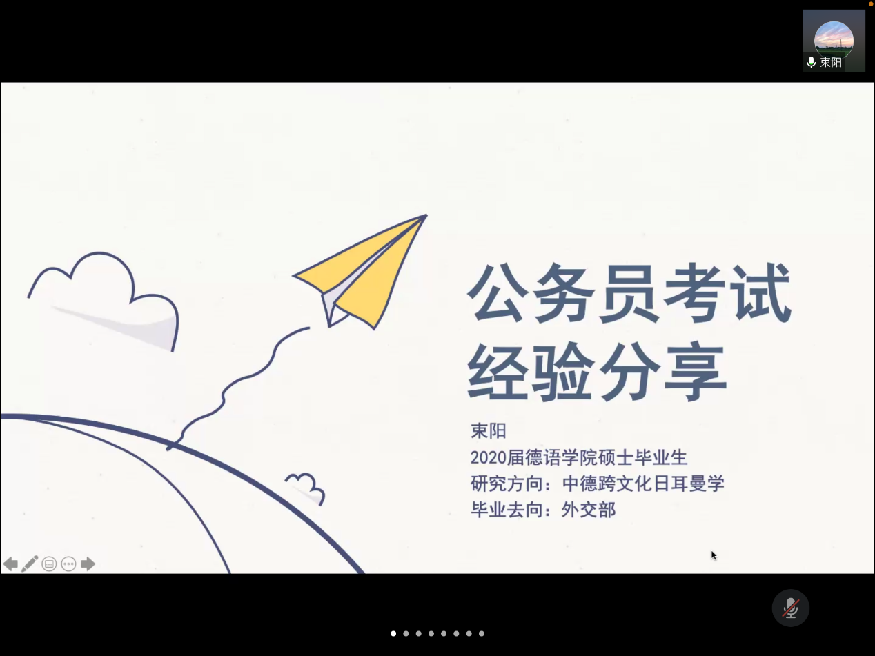 11月1日15:00,sunbet申搏公务员考试经验线上分享会成功举行。sunbet申搏2020届硕士毕业生束阳受邀与sunbet申搏本科生、研究生分享了公务员考试的流程以及备考建议,并解答了同学们的问题。会议由公司研究生会主办,研究生会徐泽茗主持。