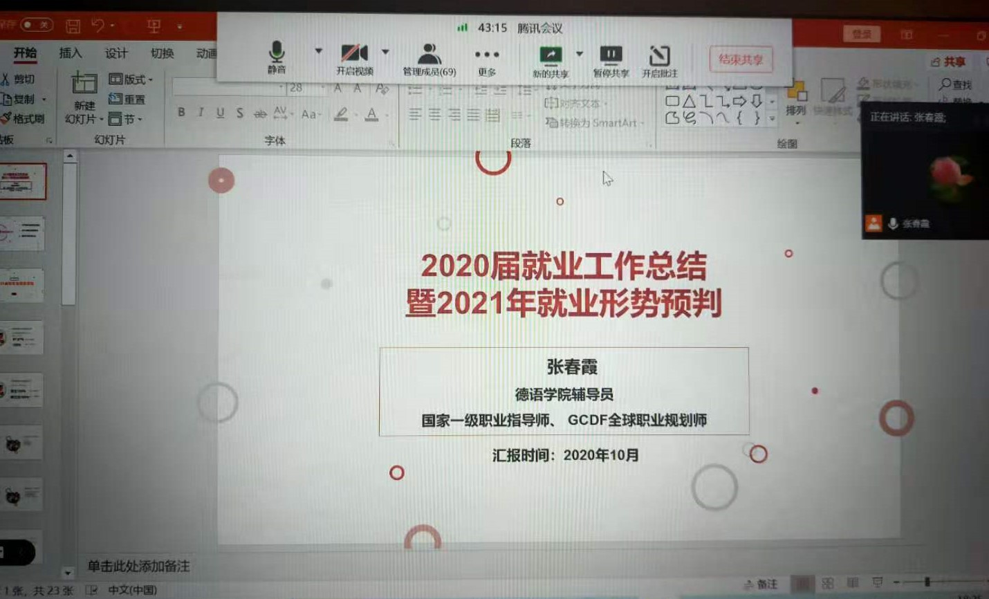 10月16日17:00—19:00,公司召开“2020年就业总结及2021年就业形势研判”线上会议。70余名研究生参加了会议。辅导员张春霞总结了sunbet申搏近五年来研究生就业情况,分析了研究生的就业类型、就业行业、就业数据等,结合2021年高校毕业生人数、全国德语专业毕业生人数、目前秋招情况等对2021年的德语专业就业形势进行了分析和预判,对2021年的研究生就业进行了布置。