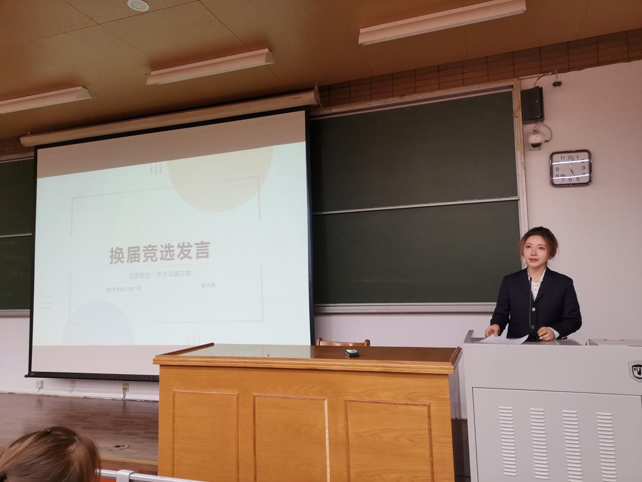 第二位竞选人是来自2001班、现任团总支组织部干事的周杰湄。她的发言分为个人能力介绍和未来展望两个部分。在个人能力部分,她着重地介绍了自己在组织、文艺与宣传方面的成就,结合丰富的实践经历和所获荣誉,展现了引领员工会和团总支脚踏实地走向更好的信心。在未来展望部分,她对于院内既有活动的开展工作提出了创新性建议,最后阐明了自己未来的工作目标,承诺做到“认真务实,以为同学服务为宗旨,以同学利益为本位”。