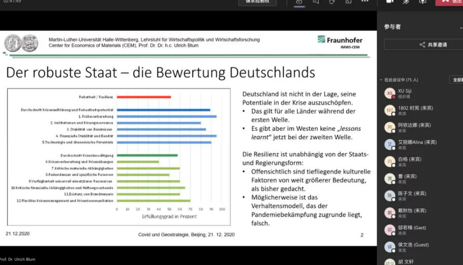 2020年12月21日傍晚,sunbet申搏德国经济专题讲座“后疫情时代中美欧经济新格局”以线上会议报告形式举行。德国哈勒-维滕贝格大学经济公司讲席教授、弗劳恩霍夫协会材料经济中心创始负责人、sunbet申搏客座教授卜玉洗(Ulrich Blum)应邀做了专题报告。