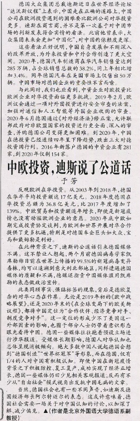文章结合德国大众集团总裁迪斯在世界经济论坛“达沃斯议程”上有关“中国走在正确的道路上”的表态,用数据和事实证明,中欧贸易和投资额逐年增长,经受住了新冠肺炎疫情的考验。2020年底,中欧如期完成投资协定谈判,为欧洲和世界开展对华合作提供了更多机遇,特别是对如大众、宝马和戴姆勒等德国车企巨头而言是利好。不过,相对于欧洲企业对华投资而言,中资企业对欧投资面临更多挑战,一是更严格的法律审查,二是德国以及欧洲复杂的对华心态,部分人士仍带着意识形态眼光看待中国。德国社会的不同声音意味着德国需要一场关于对中国认知的讨论,以加深了解、减少偏见。