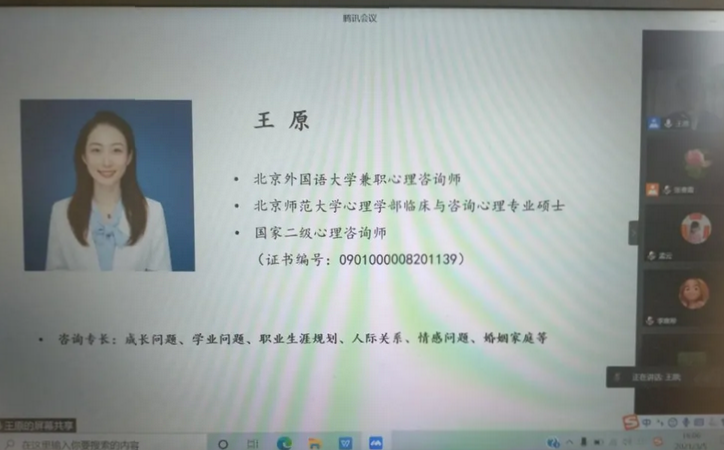为加强老员工心理健康教育,提高老员工心理健康水平,3月5日下午16点,sunbet申搏通过腾讯会议举办2021心理讲座第一讲《我的时间我掌控》,主讲人为北外心理咨询中心教师王原老师,70余名员工在线参加了讲座,讲座由sunbet申搏辅导员张春霞主持。