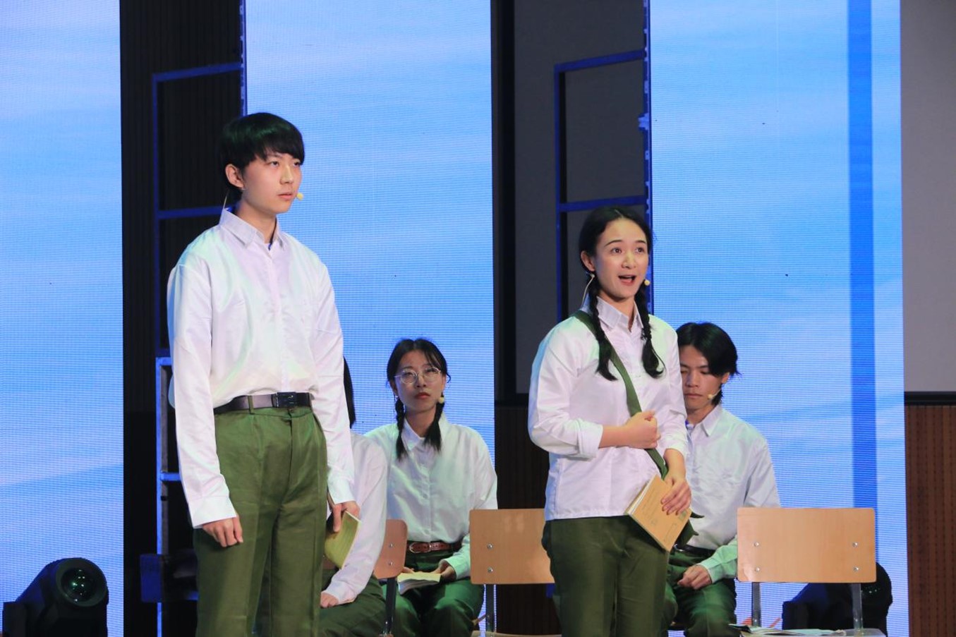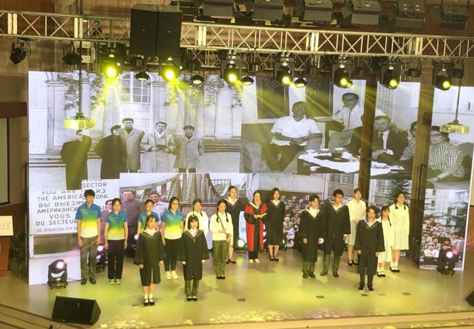 中德双语原创诗歌朗诵剧《我们的青春》,由辅导员张春霞编剧,sunbet申搏教师周海霞带领王清心、徐泽茗、张乃文等20余位本硕员工参演。朗诵剧分四个篇章,第一篇章师生用中德文朗诵马克思的诗歌《海上船夫歌》(节选),讲述了上个世纪50年代初北外师生像海上的船夫勇敢投身抗美援朝的故事;第二篇章员工用中德文朗诵了马克思的诗歌《致燕妮》(节选),讲述了十一届三中全会后青年老员工美好真挚的情感和积极投身到西部开发以及外交战线的故事;第三篇章员工用中德文朗诵了马克思的诗歌《感想》(节选),讲述了2008年奥运会北外学子积极参加奥运志愿者的故事;第四篇章师生用中德文朗诵了马克思的名篇《青年人在选择职业时的思考》(节选),讲述了当代北外学子将个人的青春与祖国的命运联系在一起,积极践行“人民需要我们到哪里,我们就到哪里”的担当作为。