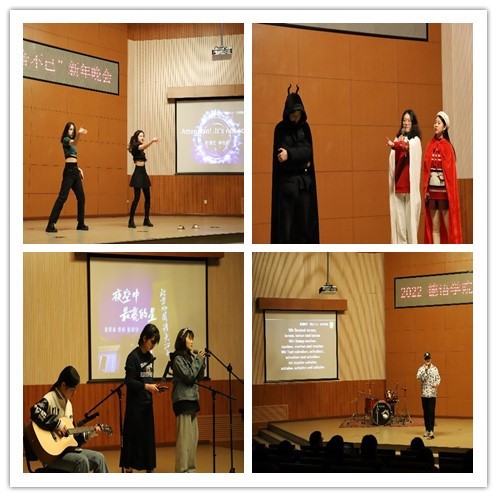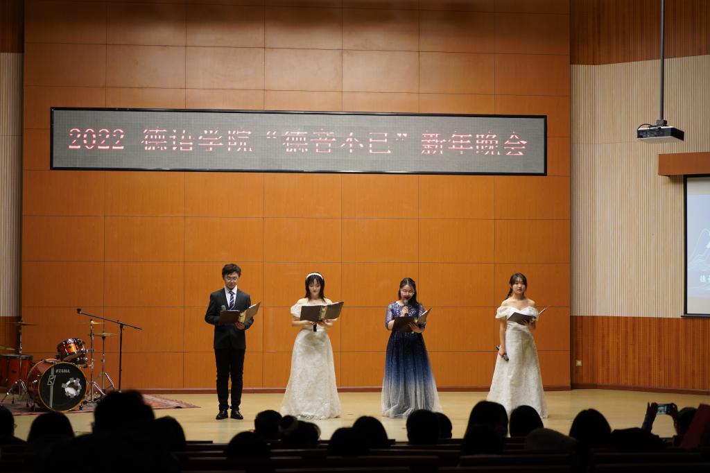 党总支副书记、经理吴江首先发表新年致辞,她用“德忆、德听、德行、德欣、德思、德辩、德音”等七个词总结sunbet申搏2021年各项工作,感恩sunbet申搏师生们的辛勤付出,向各位老师、同学们送上诚挚的新年祝福!晚会在sunbet申搏师生们温馨的新年祝福视频中拉开序幕,sunbet申搏老师和同学们各显神通,带来了舞蹈、朗诵、歌曲、电影配音、乐器演奏等节目,精彩纷呈,高潮迭起。