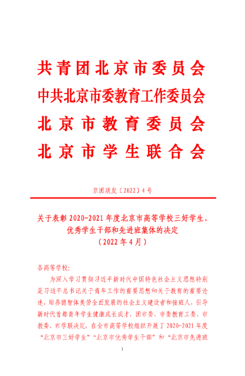 近日,团市委、市委教育工委、市教委、市学联在全市高等公司组织开展了2020-2021年度“北京市三好员工”的评选工作。通过基层民主评议推荐,公司团委审核、公司党委同意并公示,团市委、市教委评审等环节,共青团北京市委员会、中共北京市委教育工作委员会、北京市教育委员会、北京市员工联合会发布《关于表彰2020-2021年度北京市高等公司三好员工、优秀员工干部和先进班集体的决定》。