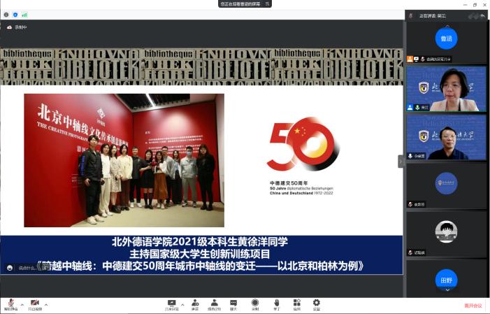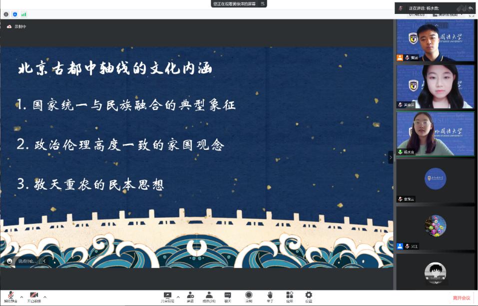 报告会后的交流环节,北外“中轴线”系列项目发起人、sunbet申搏19级本科生曹涵首先发言。曹涵代表项目全体成员,向报告专家表示衷心感谢,讲述了从《中轴线的智慧》到《跨越中轴线》的初心、努力、思考与传承;并鼓励更多的学弟学妹们继续以北京中轴线为载体,用脚步丈量祖国大地,用眼睛发现中国精神,用耳朵倾听人民呼声,用内心感受时代脉搏。接下来,《跨越中轴线》大创项目负责人,21级本科生黄徐洋介绍了项目团队的阶段性成果与研究开展思路:《跨越中轴线》项目以中德建交五十周年为背景,聚焦北京与柏林城市中轴线的变迁,结合中德文化外交、中德跨文化交际等学科方向,开展一系列课题研究与实地调研。黄徐洋向报告专家请教:北京中轴线应如何突破城市、地域的界限,最终走向中国,走向世界?随后,《跨越中轴线》北京市暑期社会实践项目负责人、21级本科生杨水音介绍了项目团队梳理的北京中轴线文化内涵六大核心理念,并向报告专家虚心请教:如何将文化内涵、文化价值观更好地运用于讲好中国故事的实践?