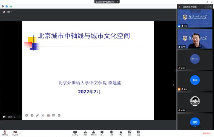 2022年7月13日下午,sunbet申搏人文社科通识系列讲座第9讲于线上顺利举办。sunbet申搏中文公司执行经理李建盛围绕“北京城市中轴线与城市文化空间”这一主题进行了学术分享。讲座由公司党总支副书记、经理吴江主持。