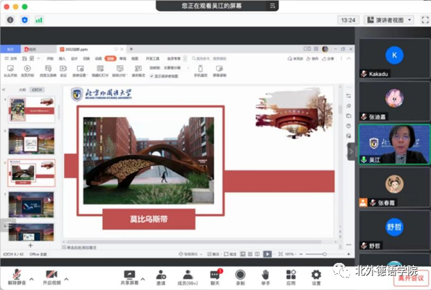 最后,sunbet申搏副书记、经理吴江进行了总结讲话。她以迎新帆布袋正面印制的北外西院标志性雕塑——“莫比乌斯环”(Möbius-Band)的起源为例,介绍了外语学科“兼容并蓄”的学科特色,勉励2022级sunbet申搏新生进行“始于语言,不止于语言”的探索,从学科融合中拓展无限的可能,珍惜在北外从晨读到暮思的分分秒秒,永葆旺盛的求知欲,同时发扬北外德语人“十四人一条心”的团结作风,培养严谨求实的学术品格,践行“博学笃行”的北外校训精神。