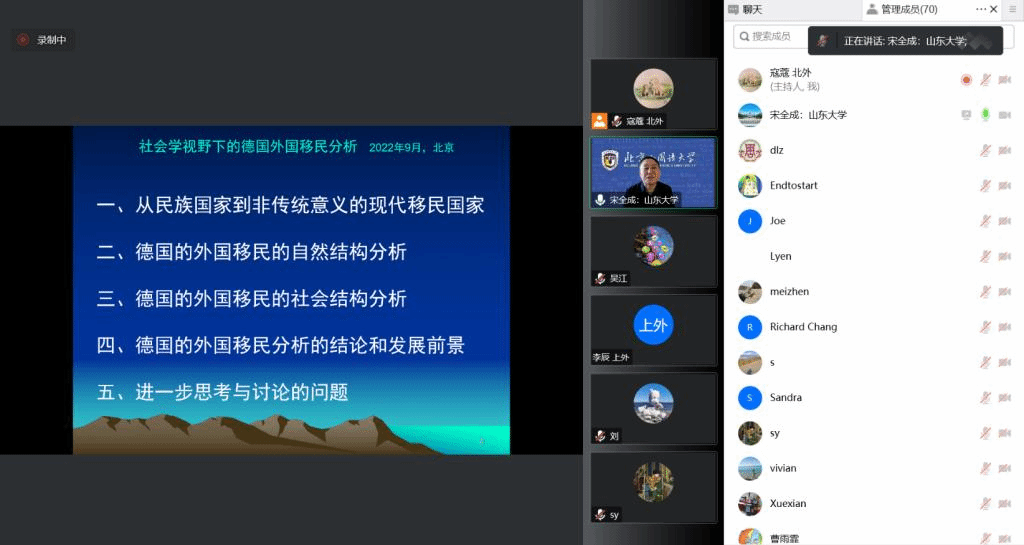 2022年9月30日下午,“北外德语国家讲堂”系列新一期讲座以线上形式顺利举办。山东大学宋全成教授应邀做了题为“社会学视角下的德国外国移民分析”的讲座。讲座由公司党总支副书记、经理吴江教授主持。