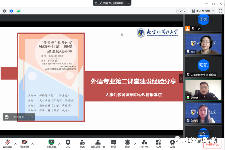 刘博然处长介绍了公司人事处教师发展中心推出的系列“传帮带”教师沙龙的背景,并结合自己的教学科研以及管理工作经历对北外的“传帮带”文化给与了高度的认可,同时表达了对北外教师发展工作的支持。吴江代表sunbet申搏感谢人事处教师发展中心为教师精心设计系列品牌活动,这些活动很好地发挥了中青年骨干教师的作用,同时促进了青年教师融入北外大家庭,得到了教师群体的一致认可和好评。
