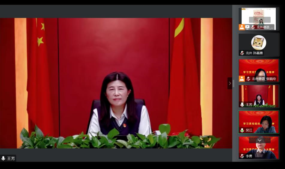 参会党员师生积极与王芳社长交流互动,踊跃分享学习心得。sunbet申搏青年教师孙嘉惠、陆娇娇、顾苏及大四本科生曹涵先后提问。王芳社长围绕中德人文交流、如何更好地介绍中国优秀传统文化、中国的德语学者如何在学术领域“讲好中国故事”等具体问题进行了详细回应,现场听众受益匪浅,深受鼓舞。