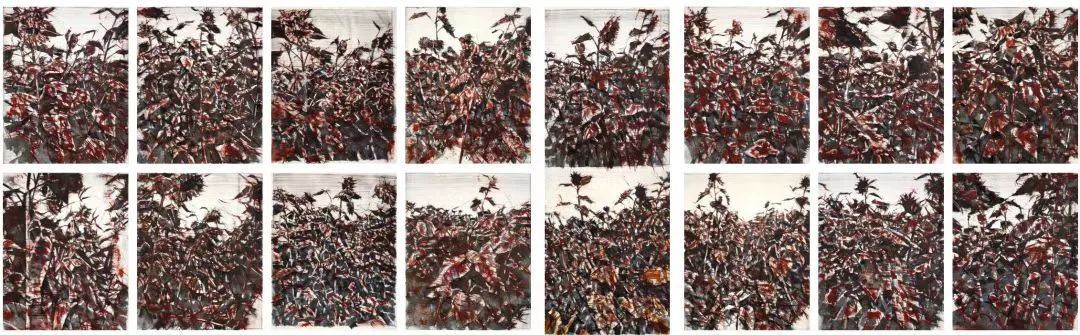 口译过程中,王静怡特别记录了几件令她印象深刻的事情:其一是范经理通过旅德中国艺术家的作品向傅融大使介绍了中德艺术之间的互译性特征,及对生命与自然的深切关注与礼赞,这表现在参展的绘画、雕塑、装置与设计作品中。如许江的系列绘画作品“葵”,它有机融合了中德传统思维与现代表征方式,透过颤动机会疾飞的笔触与深沉厚重的肌理,在吟咏“葵”之生命的颂歌中构筑起史诗般的宏阔意境。对此,傅融大使非常感兴趣,仔细询问范经理这系列作品的创作地点是中国还是德国。
