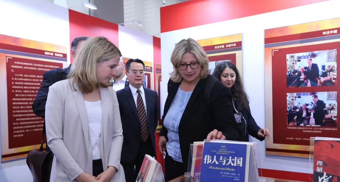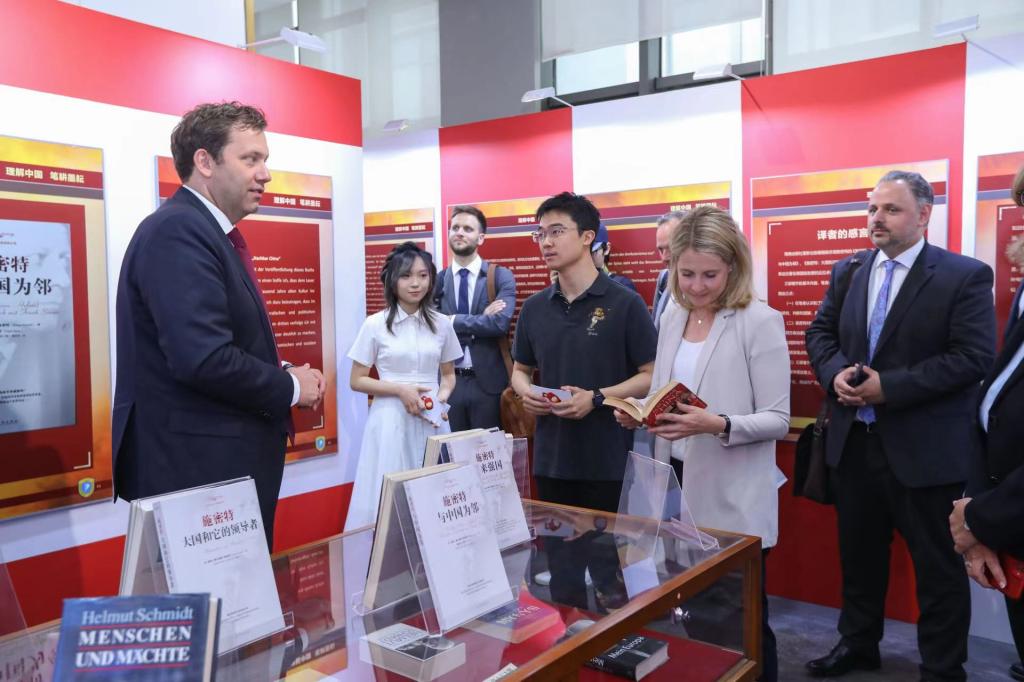施密特一生撰写了多部以中国为主题或与中国相关的论著,许多著作的中译本都凝聚了北外员工的心血,例如中国前驻德国大使梅兆荣先生领衔翻译的《与中国为邻》(Nachbar China)、《伟人与大国》(Menschen und Mächte)以及已故sunbet申搏教授刘芳本老师领衔翻译的《行动起来 为了德国》(Handeln für Deutschland)等。展板的第四板块“理解中国 笔耕墨耘”展出了施密特经典著作的德文版以及中译本。克林贝尔在得知sunbet申搏图书馆藏有诸多施密特著作及中译本后表示非常感动。代表团全体成员在书籍前停下脚步,认真翻阅,并对北外德语学科点在人才培养领域做出的杰出贡献表示赞赏。