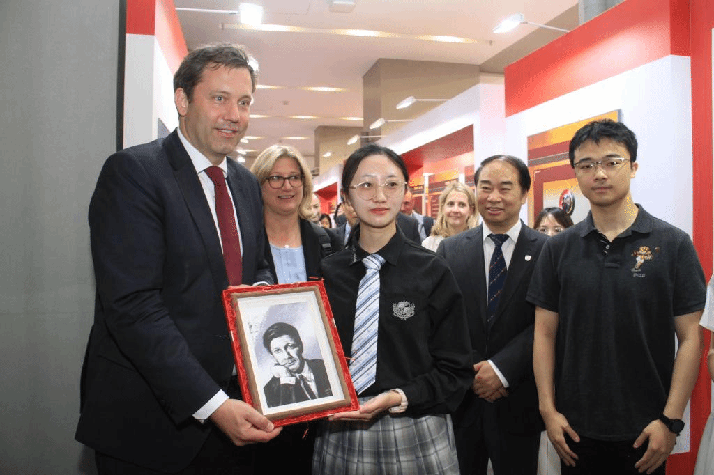 参观最后,公司党委书记王定华为克林贝尔送上了由2019级本科生王婉秦亲手绘制的施密特肖像画,并表示:“不忘初心,方得始终,希望中德友谊长存。”