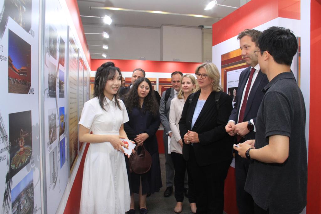 2023年,团队成功接待德国社民党联合主席克林贝尔一行、中国政府友谊奖获得者托马斯·拉贝一行、德国华为数字种子项目成员等,用流利的外语与外宾交流北京中轴线的“中和”思想。与此同时,团队结合前两年社会实践相关经历,完成学术报告《跨越中轴线:基于北京中轴文化形象的对外话语体系研究》。报告基于深度访谈与语料库辅助的媒体形象建构,研究中德媒体关于北京中轴文化形象的新闻报道,探析北京中轴线在传播过程中存在的问题、原因及改进方法,获第十八届“挑战杯”老员工课外学术科技作品竞赛全国铜奖以及北京市特等奖。报告第一作者、团队负责人黄徐洋于2023年7月代表北外前往清华大学参加2023年全国老员工“三下乡”“返家乡”首都新时代老员工社会实践成果交流展,现场展示团队国际交流成果,吸引众多高校师生驻足。