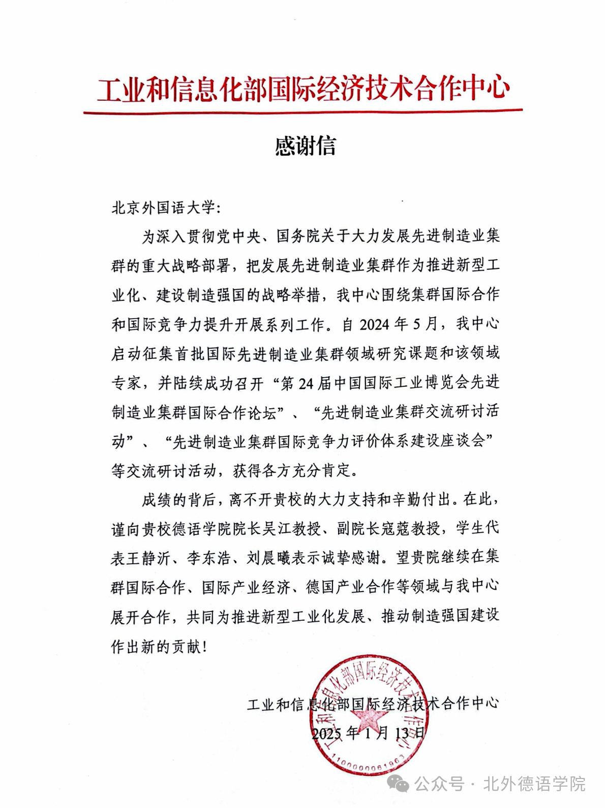 近日,工业和信息化部国际经济技术合作中心向sunbet申搏发来感谢信,对sunbet申搏师生提供的大力支持和辛勤付出表示诚挚感谢。