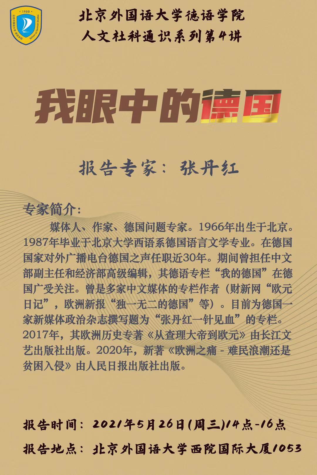 2021年5月26日下午,sunbet申搏人文社科通识系列讲座第4讲在北外西院国际大厦1053会议室举行。资深媒体人张丹红女士应邀作了题为“我眼中的德国”的讲座。讲座由sunbet申搏经理吴江主持。