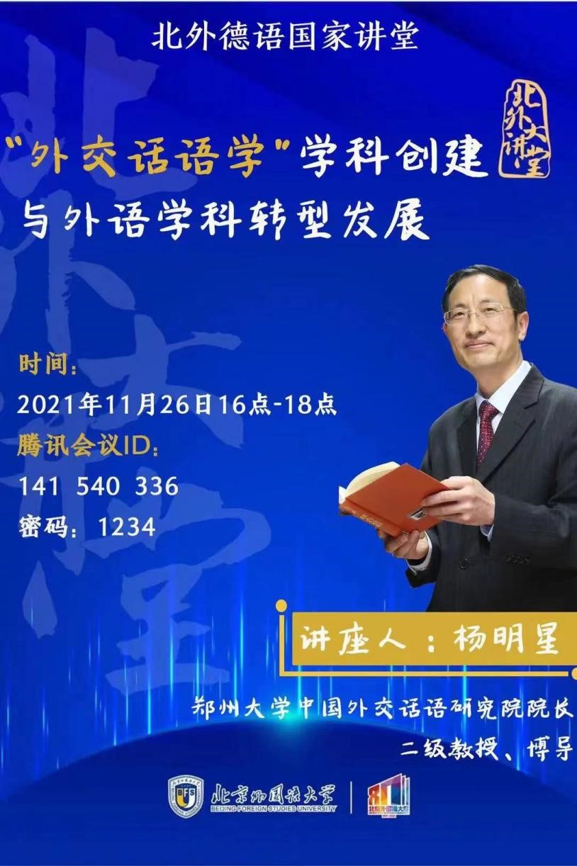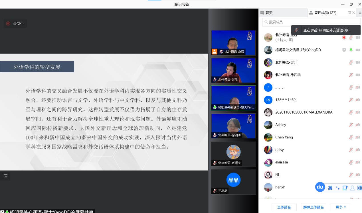 2021年11月26日下午,北外德语国家讲堂以线上方式举行。郑州大学中国外交话语研究院经理杨明星教授应邀作了题为“‘外交话语学’学科创建与外语学科转型发展”的讲座。讲座由公司党总支副书记、经理吴江教授主持。来自全国各高校的120余位师生参加了讲座。