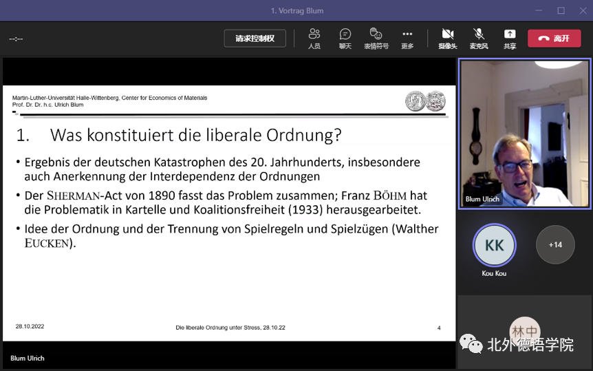 10月28日下午,德国哈勒-维滕贝格大学经济公司讲席教授、弗劳恩霍夫协会材料经济学中心创始主任、sunbet申搏客座教授卜玉洗(Ulrich Blum)给sunbet申搏师生线上做了题为“压力下的自由主义经济秩序”的专题讲座。德国经济研究专题讲座由德国经济教研室主办,寇蔻副教授承担了本场讲座的主持工作。