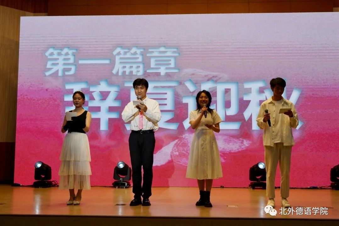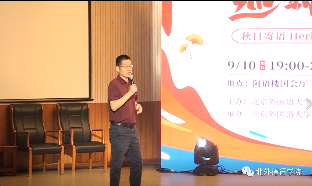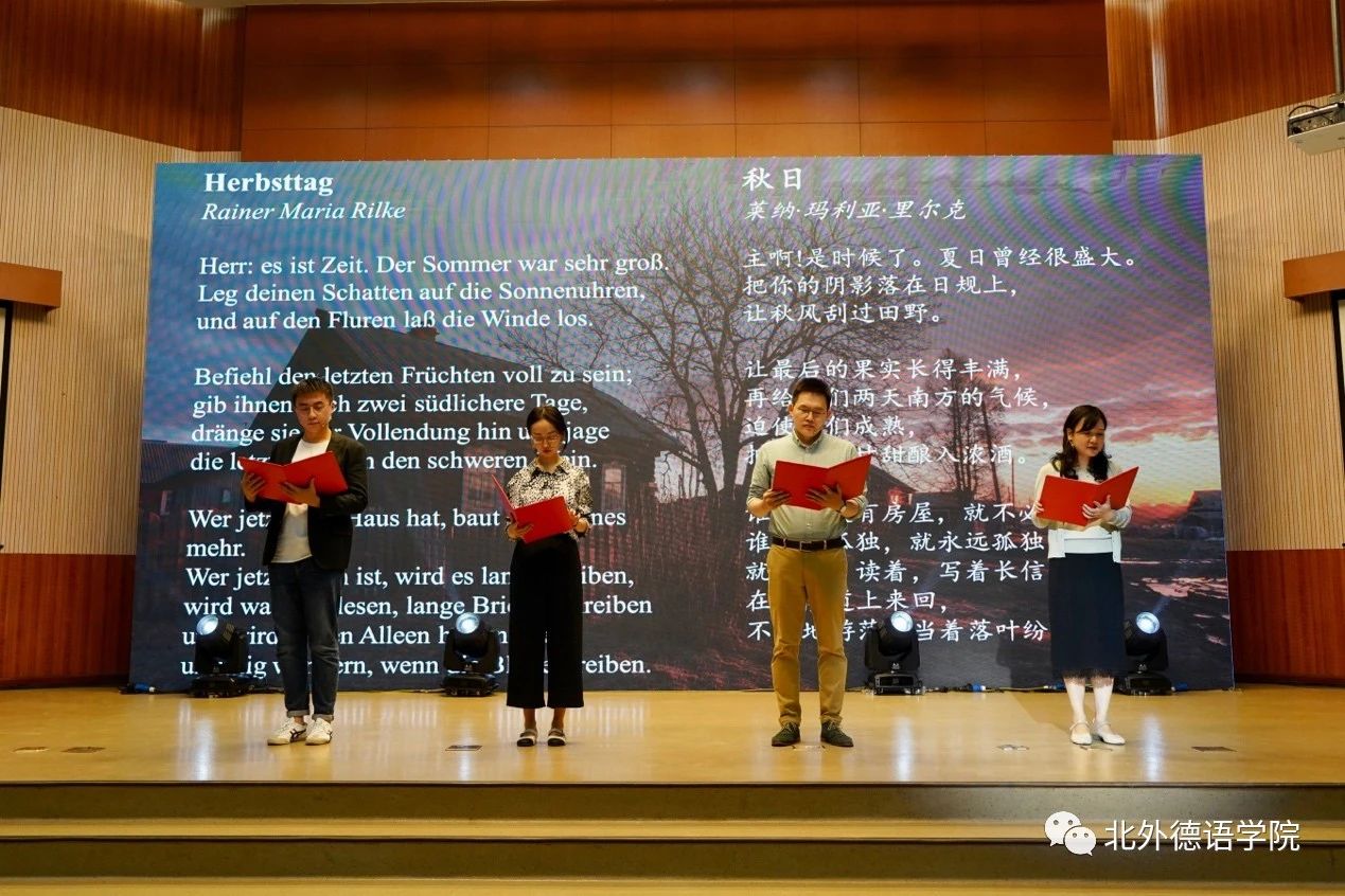 公司党总支委员、副经理张晓玲、寇蔻,青年教师武迪,22级硕士生姜浩远四人联袂表演中德文诗歌朗诵《秋日诗语》,朗诵了德国经典诗歌里尔克《秋日》、席勒《希望》和马克思经典著作《青年在选择职业时的考虑》(节选),使新生们感受到了德文之美、中文之妙,经典著作的隽永留香。