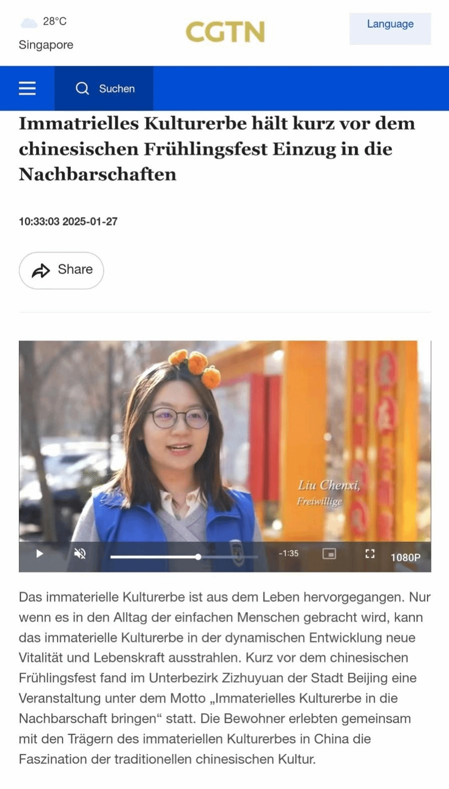 活动结束后,刘晨曦作为志愿者接受了央视国际频道CGTN的采访。她表示,非遗承载着中华民族的历史记忆,写春联不仅是书写文字,更蕴含着人们对美好生活的期盼;剪纸和绒花精湛的制作工艺也是先辈们智慧的结晶。本次活动通过展现非遗文化的魅力,助力传统文化在新时代焕发新活力。