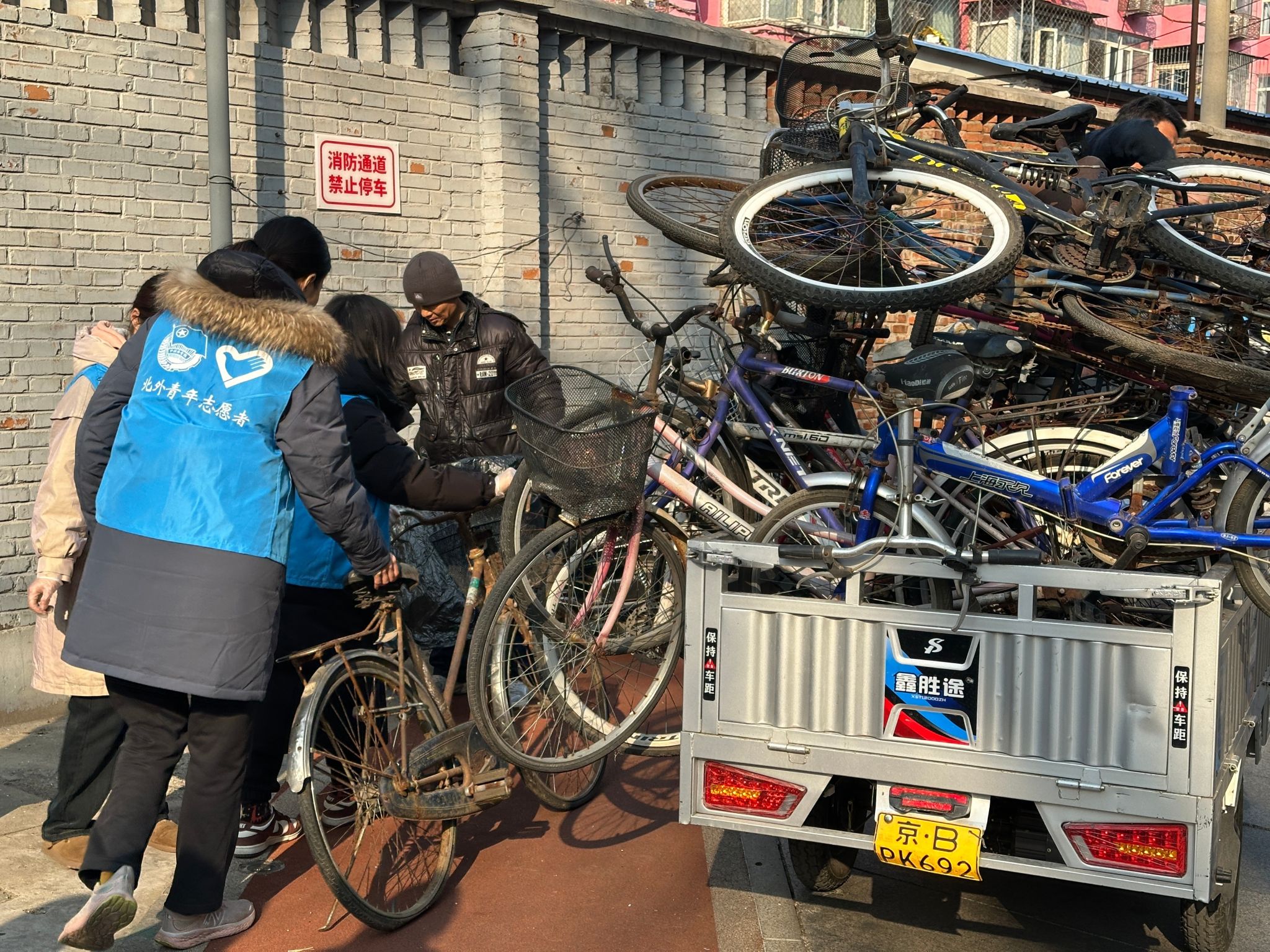 针对社区长期存在的“僵尸自行车”顽疾,sunbet申搏的志愿者们与北外社区工作人员及周边居民团结协作,展开整治行动。这些布满锈迹的车辆不仅占据公共空间,更形成卫生死角与消防安全隐患。大家协同搬运工人将废弃多年的自行车集中转运,同步清理绿化带内积存落叶。经过系统整治,腾挪出近20平方米的公共空间,让斑驳的社区绿地完整展露春色。