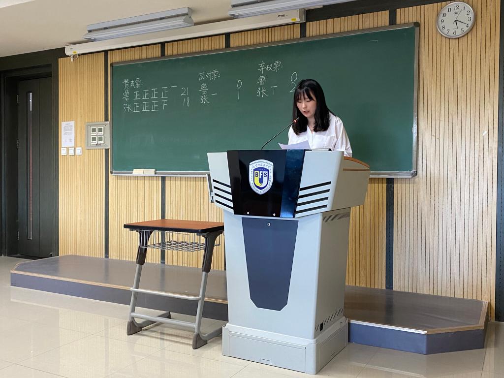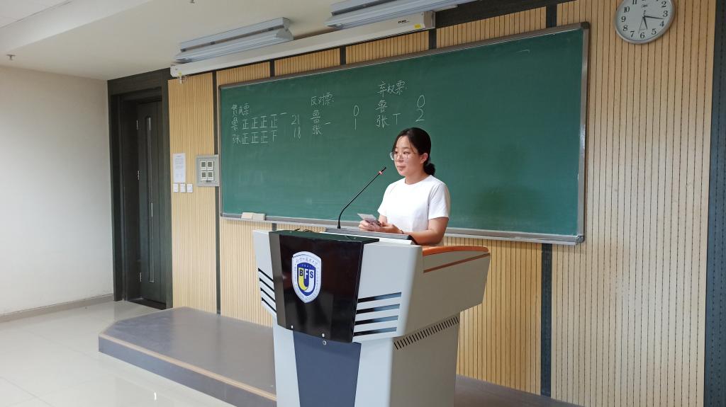 文体部副部长王静璇代表计票工作组报告了发出和收回选票的情况,确认选举有效,并宣读了计票结果。主持人宣布鲁鸥梦、张砚池当选为公司研究生会主席团成员。